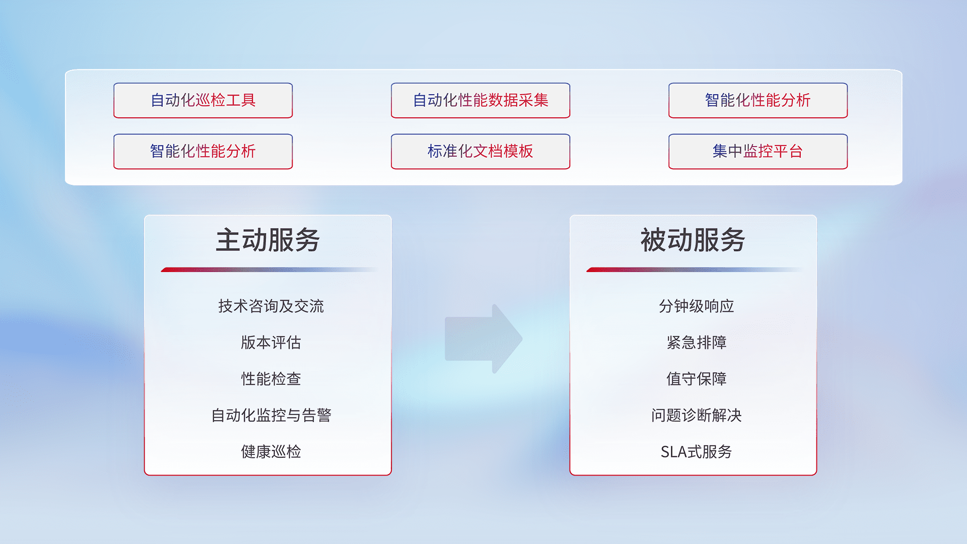 智能化工具和标准化文档,,,,保障服务质量,,提供主动服务(包含技术咨询、、、、版本评估、、、性能检查、、、、自动化监控与告警、、、、健康巡检)和被动服务包含(分钟级响应、、、、紧急排障、、值守保障、、、问题诊断解决、、、、SLA服务)。。。