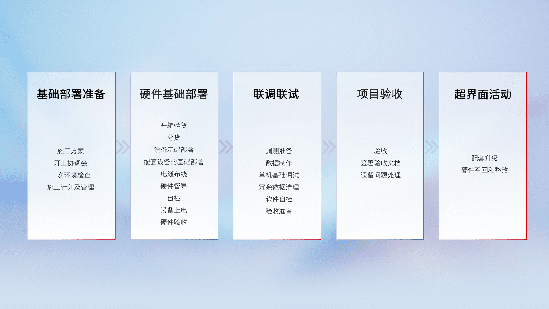 从基础部署准备、、、硬件基础部署、、、联调联试、、项目验收、、、越界面活动的全过程可追溯,,,保证施工质量和进度。。。